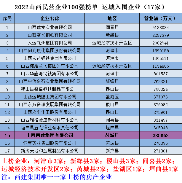 該榜單由山西省工商聯(lián)官方權(quán)威發(fā)布,以下為運城市上榜企業(yè)名單: